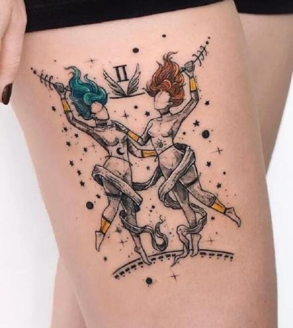 美女大腿上有创意的双子座纹身图案