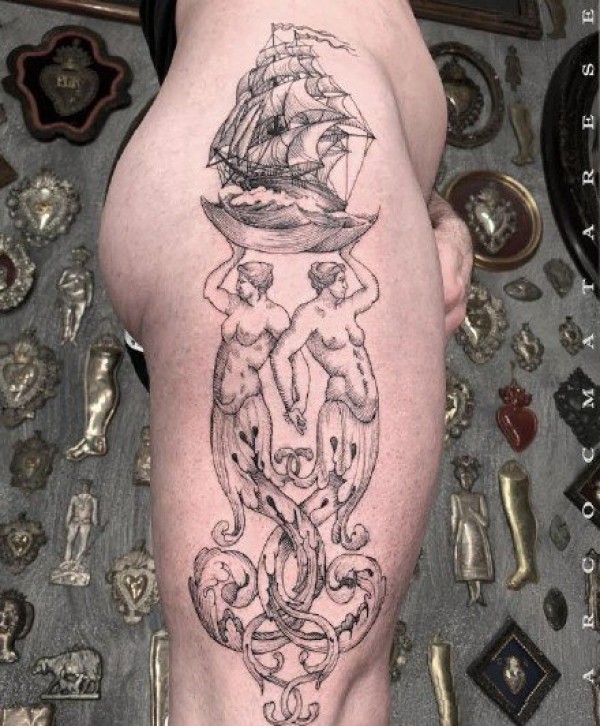 手臂大腿黑灰纹身文艺复兴题材纹身图片