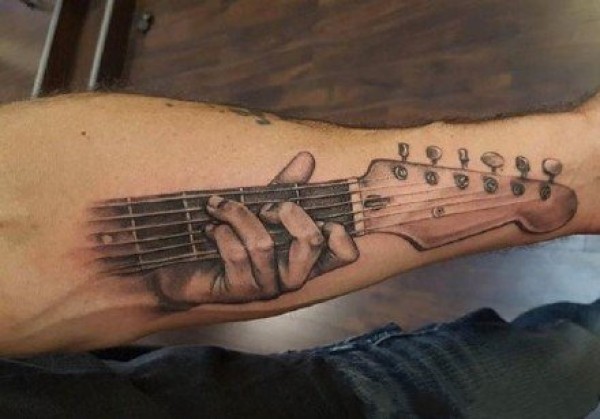 男生手臂上黑色简单线条星空元素手弹吉他纹身图片