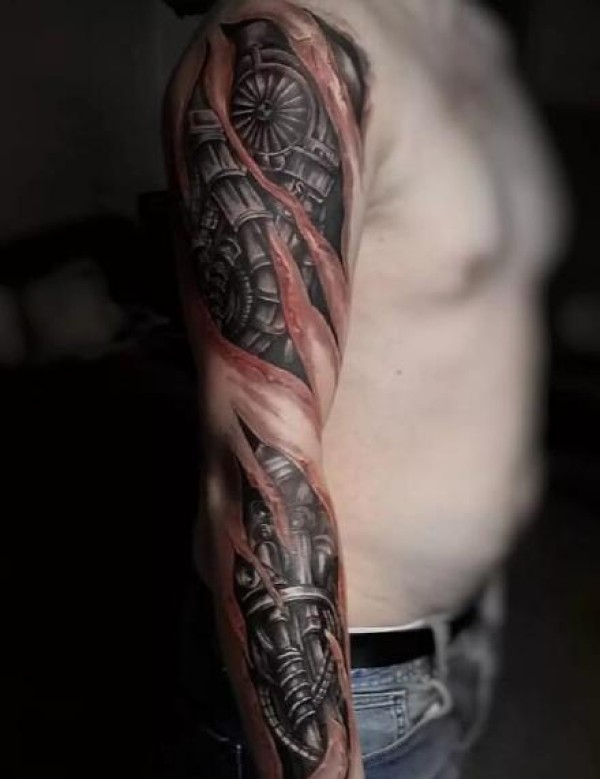 超帅气的男性包手臂的机械手臂纹身图案
