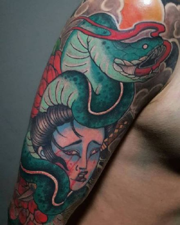 花臂:一组老传统风格的大花臂纹身图片