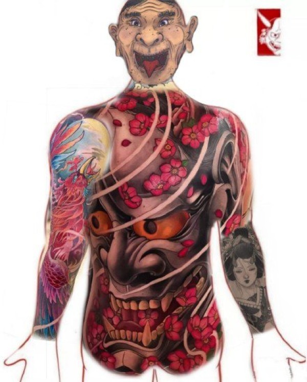 新传统风格的9张男性黑灰大满背纹身图案图片