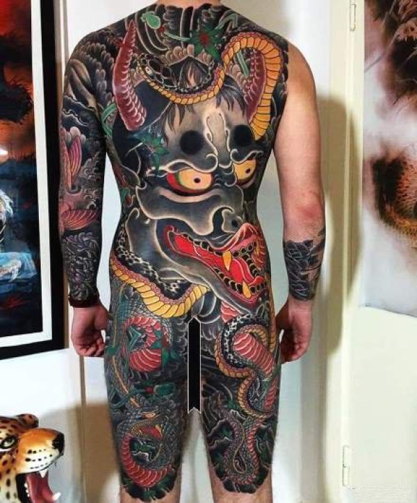 新传统风格的9张男性黑灰大满背纹身图案图片