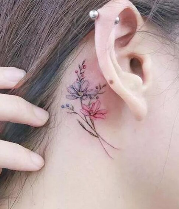 女生耳后小清晰彩色花纹身图片由纹身提供