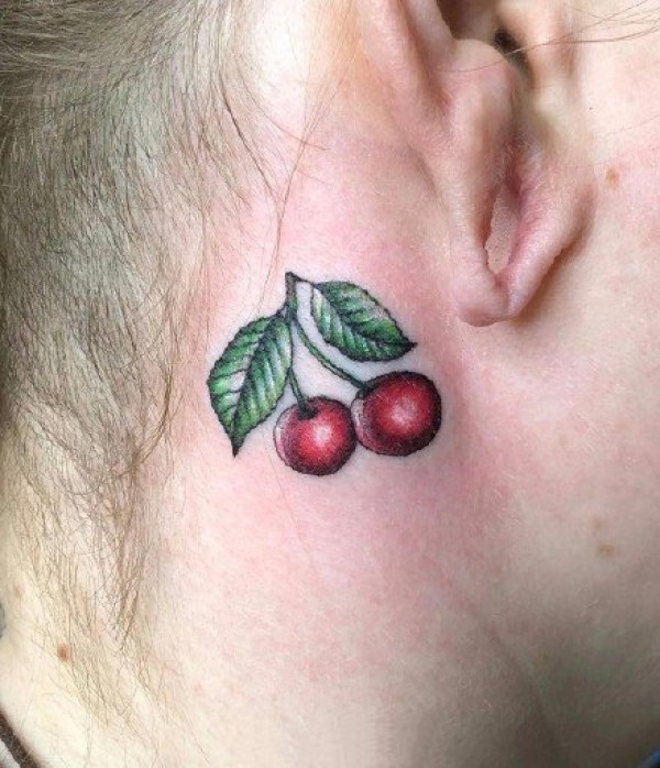 耳朵后面逼真的樱桃和蝴蝶结纹身图案