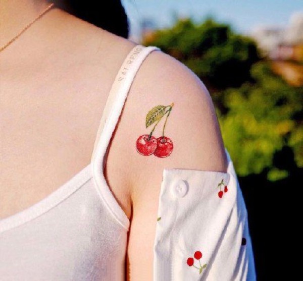 女性身上看起来是如此可口的水果樱桃纹身图案