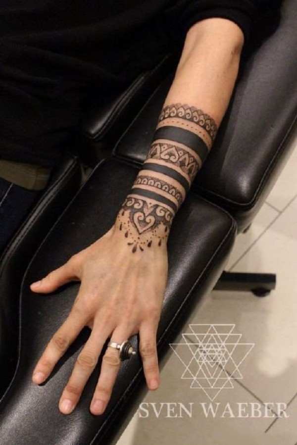 小臂手腕处很有民族风情的手环臂环纹身图案