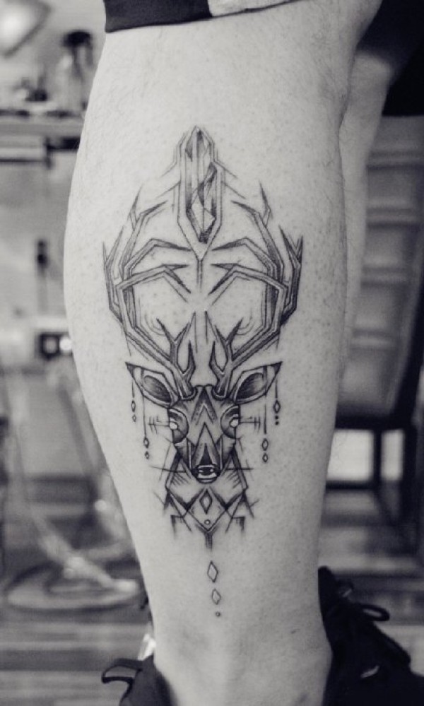 小腿麋鹿玫瑰几何点刺线条纹身图案