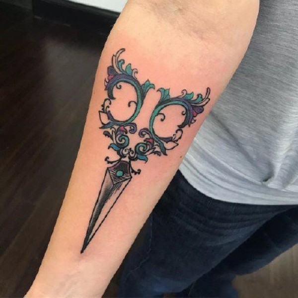 小臂剪刀玫瑰花纹身图案