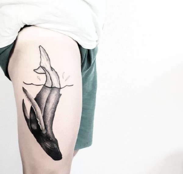 大腿上黑白灰风格点刺身抽象线条人物肖像纹身图片