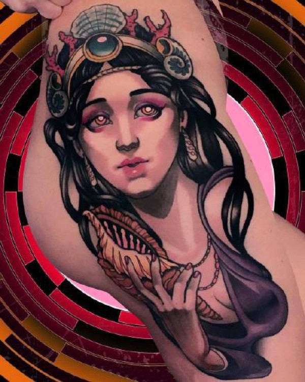 大腿上的国外欧美彩色new school 花腿纹身