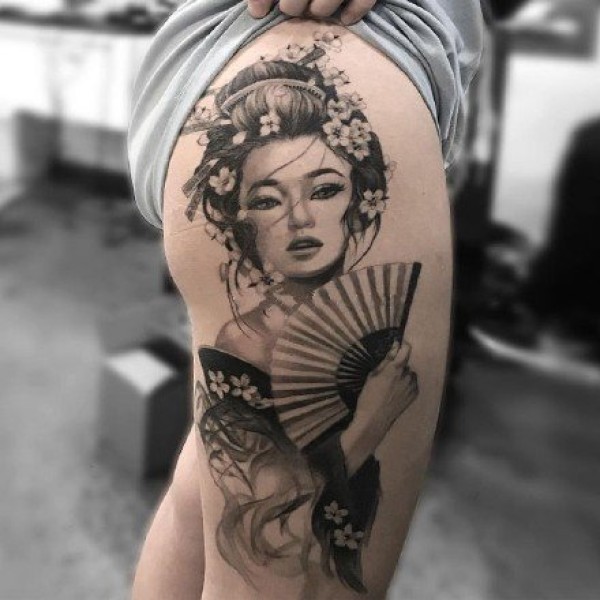 大腿女郎纹身 点刺线构大腿素描概念风女郎大腿纹身作品