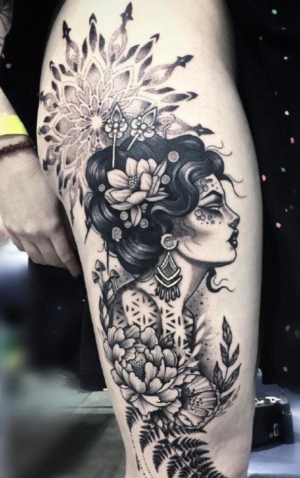 大腿女郎纹身 点刺线构大腿素描概念风女郎大腿纹身作品