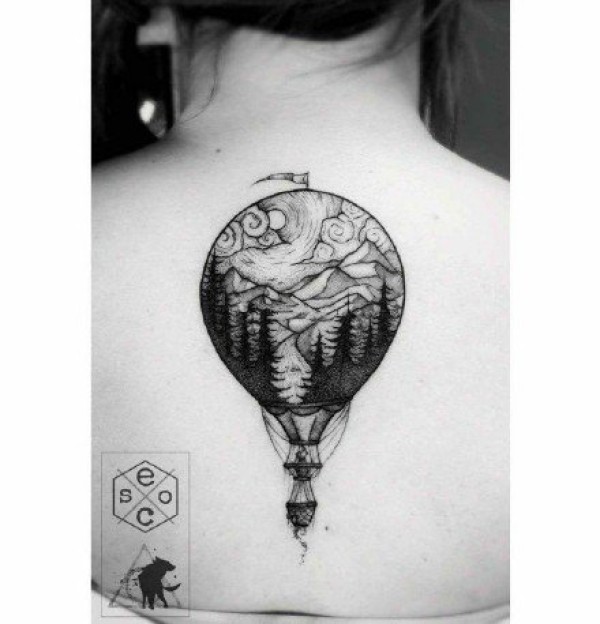 手臂纹身图片 男生手臂上人物和热气球纹身图片