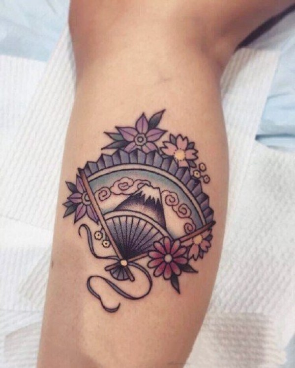 包小腿彩色经典传统艺妓莲花扇子纹身图案