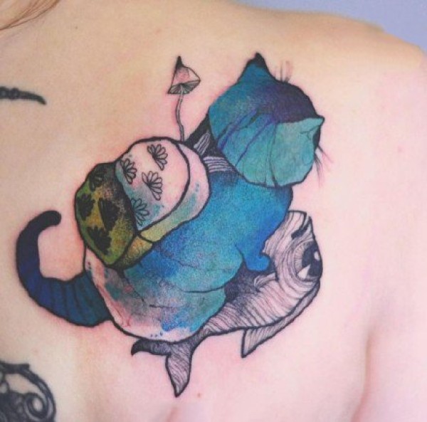 蓝绿色创意的一组猫主题纹身图片