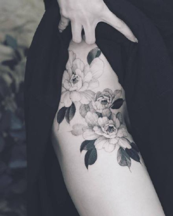 性感大腿纹身 女士大腿处性感的花花纹身图片