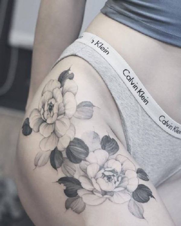 性感大腿纹身 女士大腿处性感的花花纹身图片