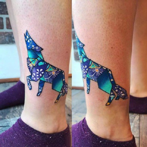 男生小腿上黑色几何简单线条折纸独角兽纹身图片