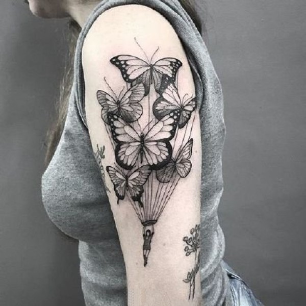 手臂纹身图片 男生手臂上人物和热气球纹身图片