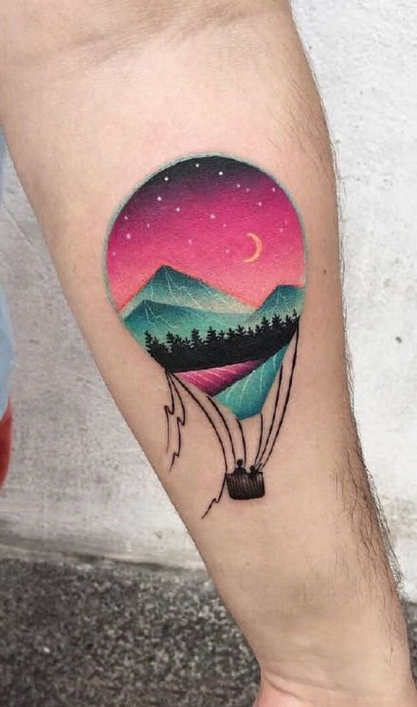 手臂纹身图片 男生手臂上人物和热气球纹身图片