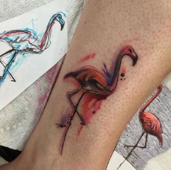 百乐动物纹身 女生小腿上彩色的火烈鸟纹身图片