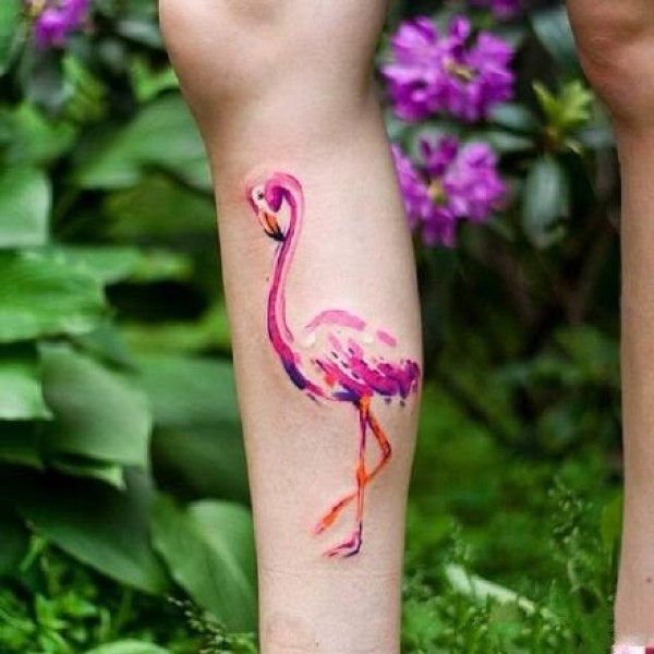 百乐动物纹身 女生小腿上彩色的火烈鸟纹身图片