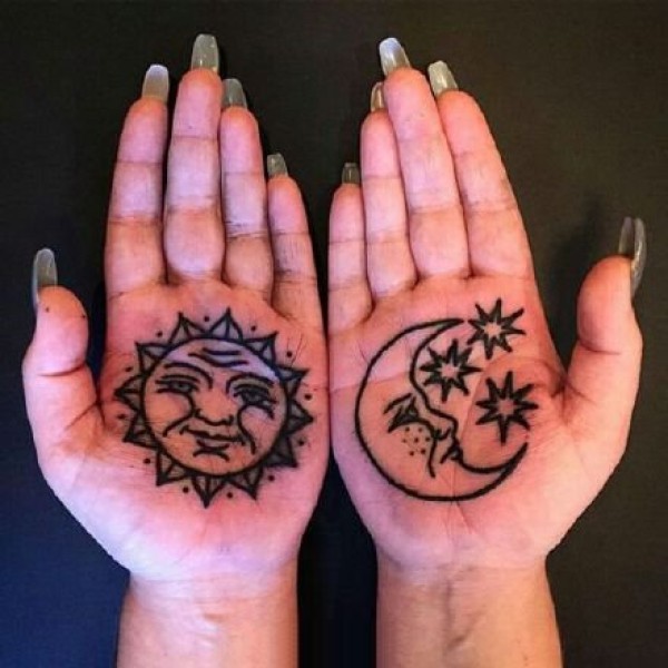 难以置信的黑灰海平面与南针和棕榈树纹身图案