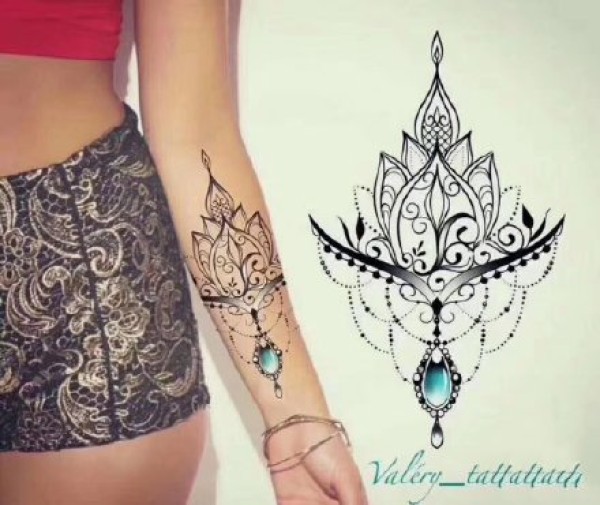 手背到小臂上的黑色点刺梵花纹身图案9张