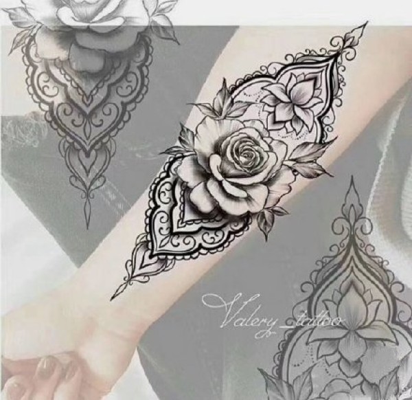 手背到小臂上的黑色点刺梵花纹身图案9张
