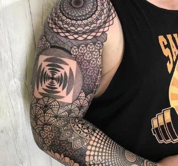 密密麻麻的几何梵花主题的大黑臂纹身