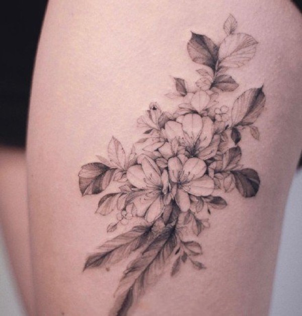 大腿素花纹身 女士大腿处性感的素花纹身图片