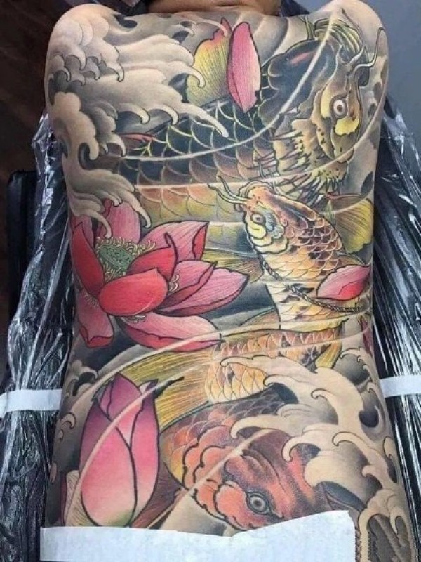 新传统鲤鱼主题的9款彩色满背大图纹身作品