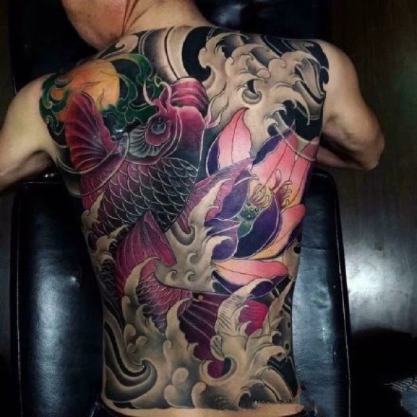 新传统鲤鱼主题的9款彩色满背大图纹身作品
