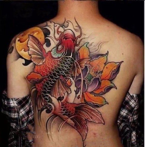 新传统鲤鱼主题的9款彩色满背大图纹身作品
