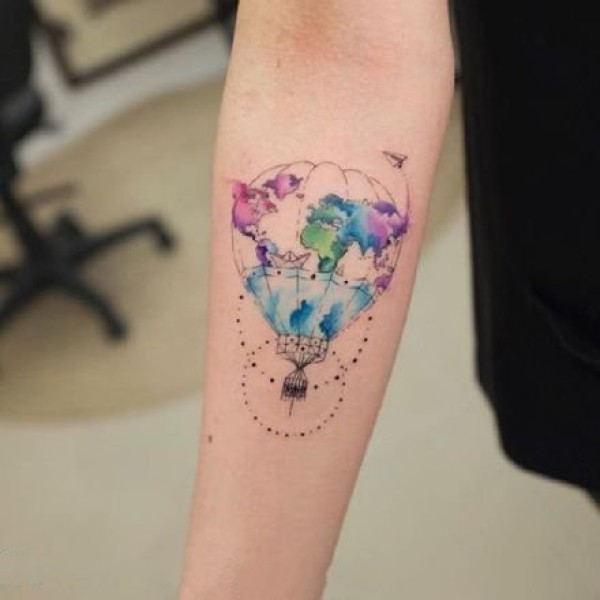 手臂纹身图片 男生手臂上人物和热气球纹身图片
