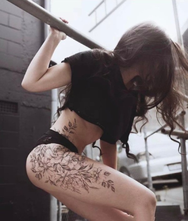性感大腿纹身 女士大腿处性感的花花纹身图片