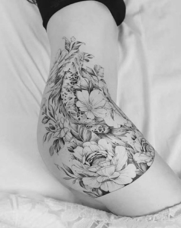 性感大腿纹身 女士大腿处性感的花花纹身图片