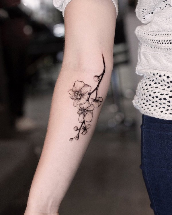 纹在手臂胳膊上的黑灰素花花卉纹身图案欣赏