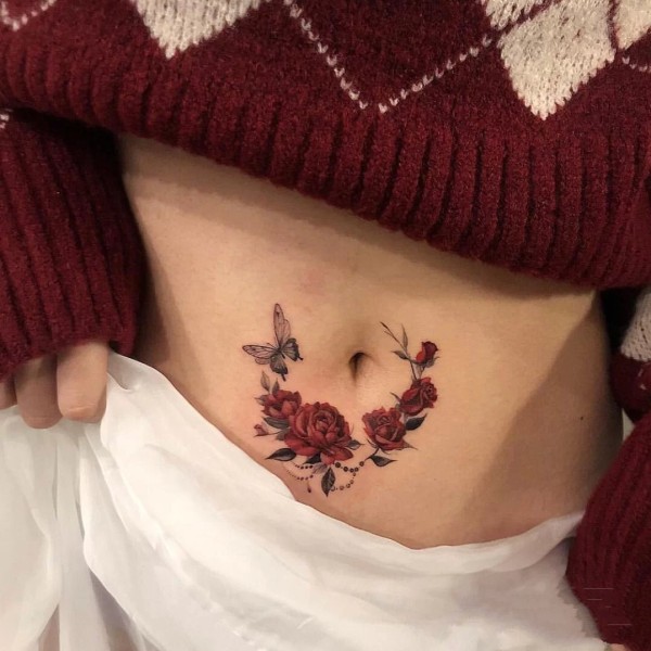 美女腰部鲜艳玫瑰花纹身图案