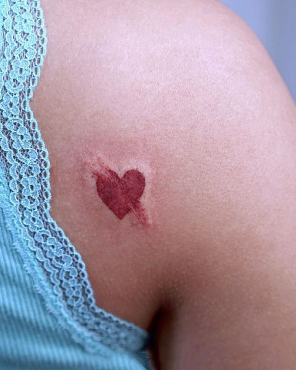 女生锁骨下黑灰素描点刺技巧创意比心纹身图片
