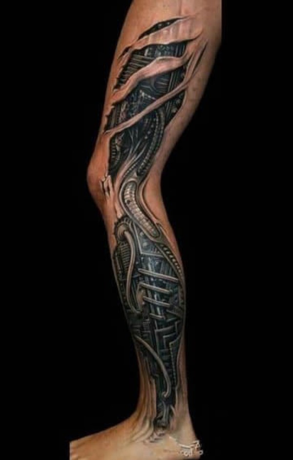 小腿3d机械彩色纹身图案