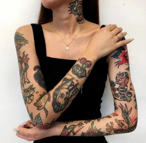 oldschool风格的拼接花臂纹身作品欣赏