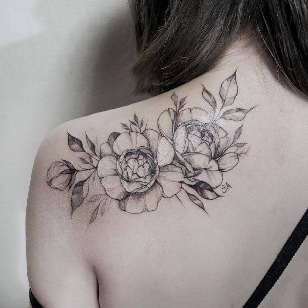 大臂素花纹身 9款女士的大臂黑灰花朵植物纹身图案