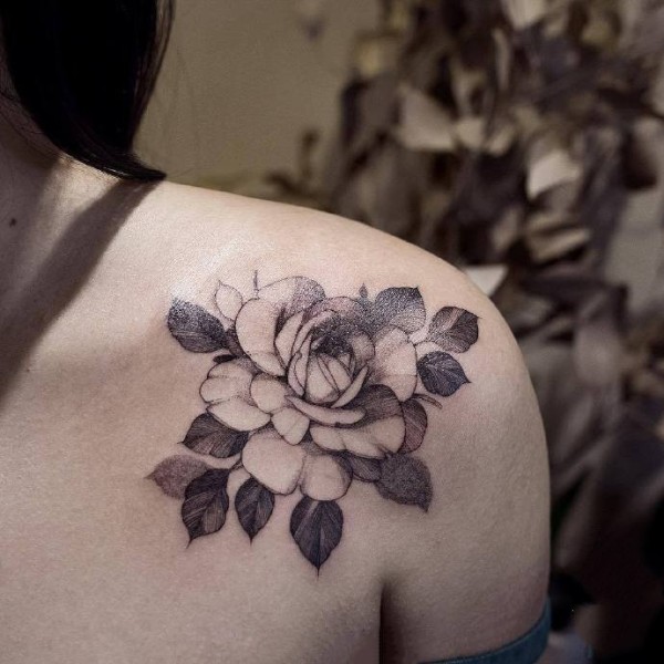 大臂素花纹身 9款女士的大臂黑灰花朵植物纹身图案