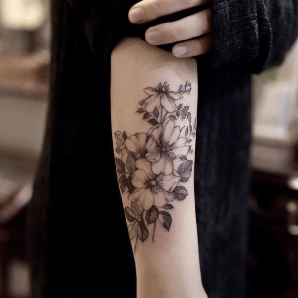 大臂素花纹身 9款女士的大臂黑灰花朵植物纹身图案