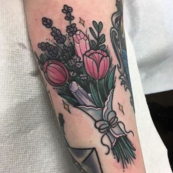 纹在手臂胳膊上的黑灰素花花卉纹身图案欣赏