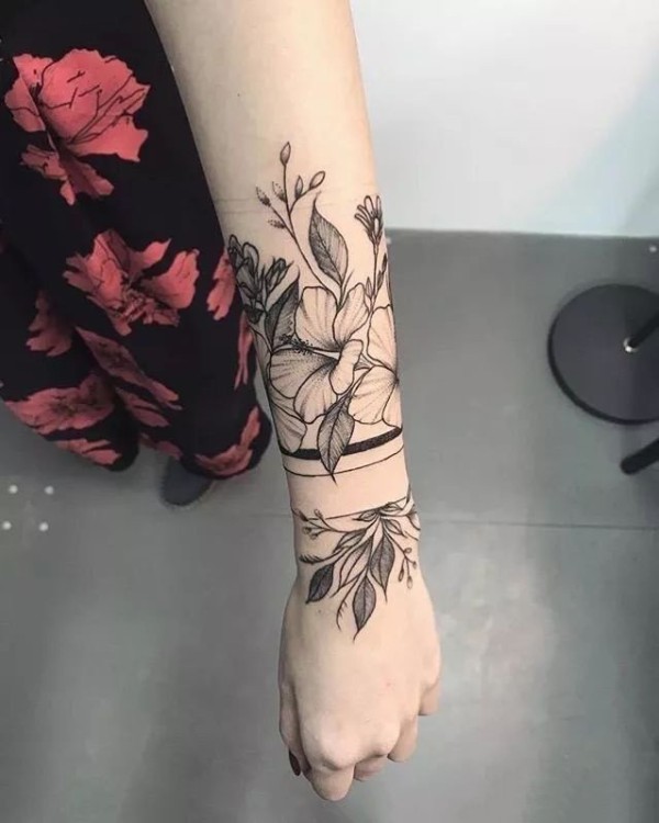 大臂素花纹身 9款女士的大臂黑灰花朵植物纹身图案