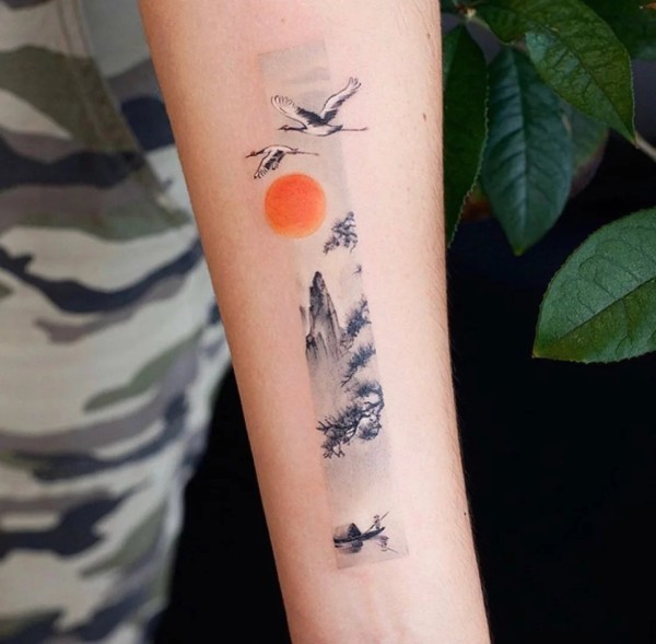 仙鹤纹身--中国风水墨元素的一组仙鹤纹身图案作品