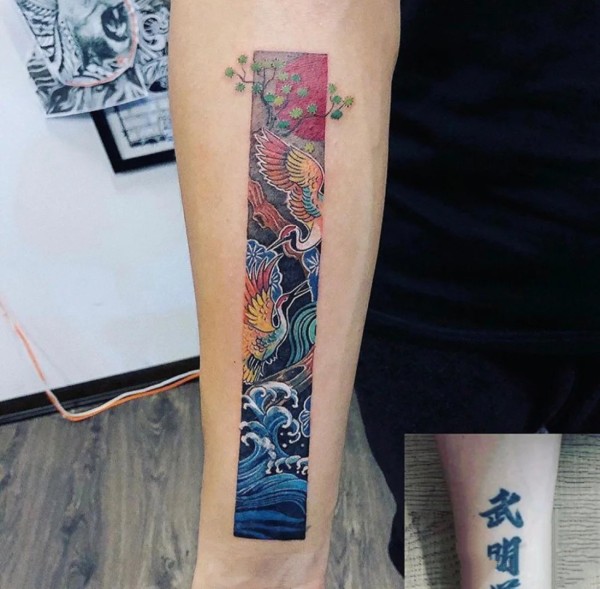 以仙鹤、山、云雾、红日遮盖的纹身